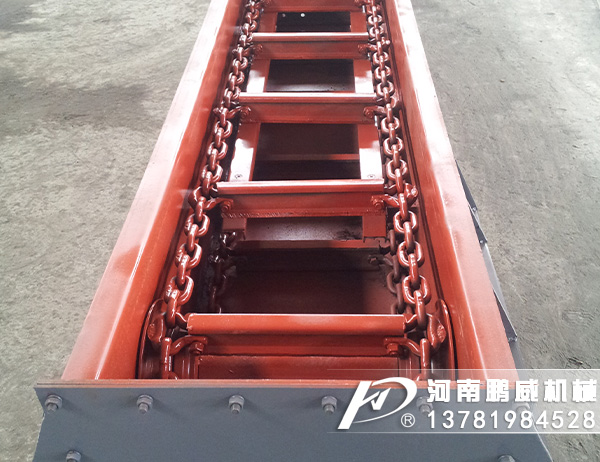 刮板輸送機(jī)的工作原理是,將敞開(kāi)的溜槽,作為煤炭、矸石或物料等的承受件,將刮板固定在鏈條上(組成刮板鏈),作為牽引構(gòu)件。當(dāng)機(jī)頭傳動(dòng)部啟動(dòng)后,帶動(dòng)機(jī)頭軸上的鏈輪旋轉(zhuǎn),使刮板鏈循環(huán)運(yùn)行帶動(dòng)物料沿著溜槽移動(dòng),直至到機(jī)頭部卸載。刮板鏈繞過(guò)鏈輪作無(wú)級(jí)閉合循環(huán)運(yùn)行,完成物料的輸送。